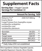 Ingredients: Makzyme-Proâ„¢, Enzyme Blend (Fungal Protease from Aspergillus oryzae, Lactobacillus acidophilus, Lactobacillus cases, Lactobacillus plantarum), Bromelain, Papain, Fungal Lipase, Fungal Lactase, Alpha Galactosidase, Cellulose (Vegetable Capsule), vegetable Magnesium Stearate, Silicon Dioxide.