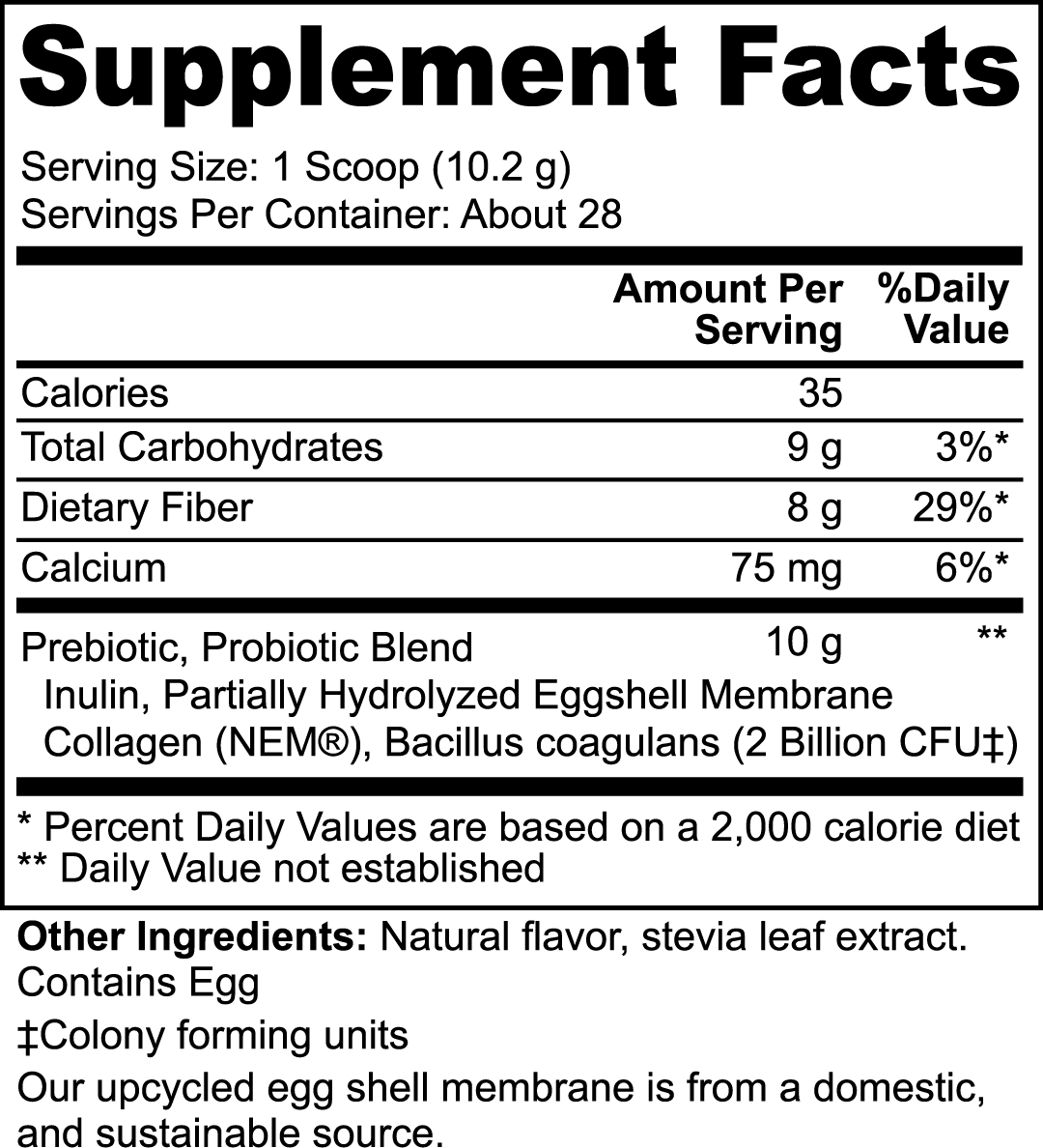 Ingredients: Prebiotic, Probiotic Blend (Inulin, Partially Hydrolyzed Eggshell Membrane Collagen (NEM®), Bacillu scoagulans (2 Bilion CFUU‡), Natural Flavor, stevia leaf extract. Contains Egg.